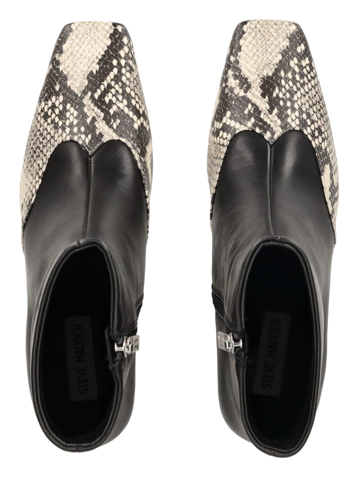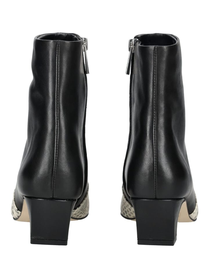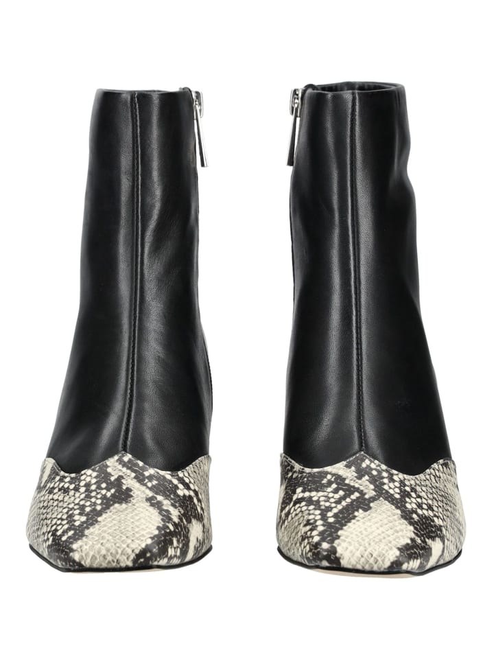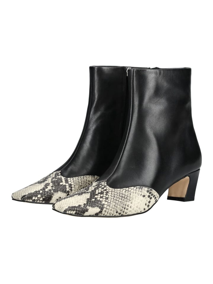 Эти элегантные ботильоны сочетают в себе классические формы с модными акцентами. Гладкий верх стильно дополнен эффектными деталями со змеиным принтом на носке и пятке. Удобный блочный каблук обеспечивает надежную поддержку и высокий уровень комфорта, а боковая молния позволяет легко надевать и снимать. Модный аксессуар, который дополнит любой образ, будь то повседневный или торжественный.