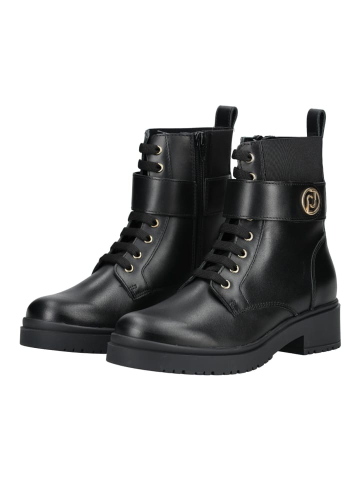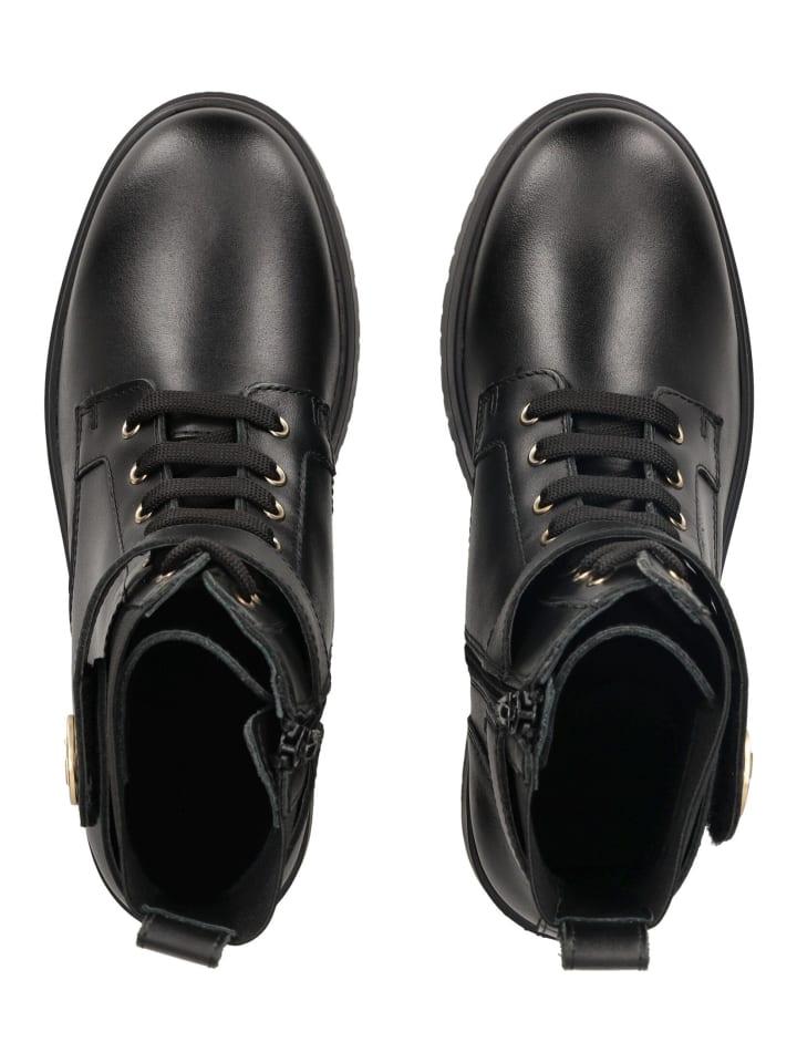 Эти ботинки сочетают в себе прочный дизайн и женственную элегантность. Высококачественная гладкая кожа черного цвета дополнена золотистыми люверсами и декоративной аппликацией с логотипом. Шнурки и боковая молния обеспечивают легкое надевание, а профилированная подошва обеспечивает надежное сцепление. Универсальный аксессуар, который можно носить как с джинсами, так и с платьями.