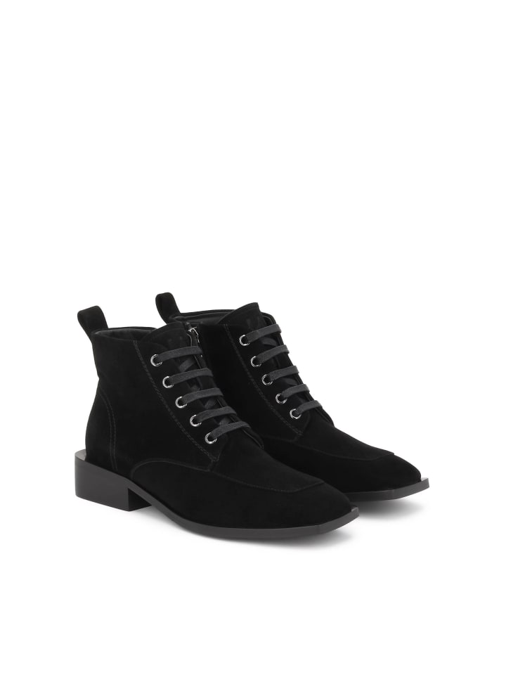 Черные ботинки из мягкой замши - воплощение современной элегантности с нотками ретро. Они отличаются изящной, но выразительной деталью - фирменным швом вдоль скошенного носка, придающим им уникальный и изысканный вид. Ботинки оснащены классической шнуровкой и практичной молнией с внутренней стороны для быстрого и легкого надевания и снимания без необходимости их завязывать. Устойчивый низкий каблук обеспечивает комфортную повседневную носку, а сбалансированные пропорции делают их идеальным дополнением как к джинсам, так и к более женственным вещам базового гардероба. Это идеальный выбор для переходного периода - для женщин, которые ищут элегантную, но оригинальную обувь с уникальным характером. Мягкая полуанилиновая овчина подкладка гарантирует исключительный комфорт, а искусственный мех согревает в холодные дни. Верх: кожа; Подкладка: другой материал; Стелька: другой материал; Подошва: другой материал