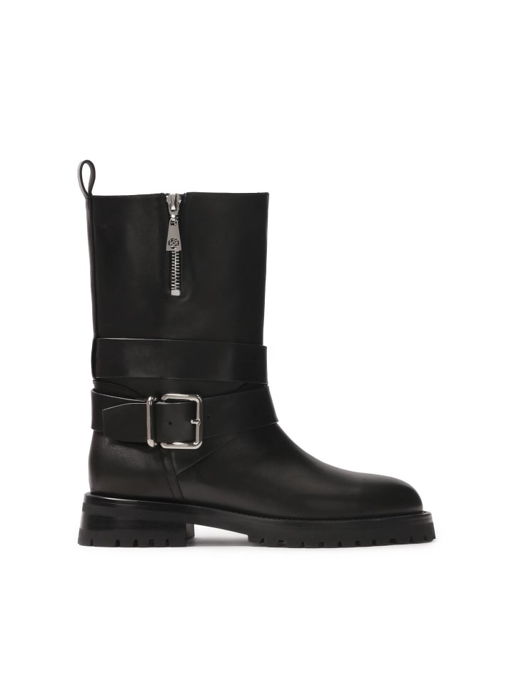 Черные ботинки без застежек - стильный и практичный выбор на каждый день. Изготовленные из высококачественной натуральной кожи, они отличаются минималистичным дизайном с тонкими, но эффектными деталями. Плоская подошва обеспечивает комфорт и устойчивость, идеально подходя для городского стиля. Фирменный элемент дизайна - двойной ремешок с пряжкой вокруг голенища, добавляющий немного авангардного штриха. Дополнительная короткая молния позволяет легко регулировать голенище, обеспечивая лучшую посадку и больший комфорт. Эти универсальные ботинки дополнят как повседневный, так и более изысканный современный образ.