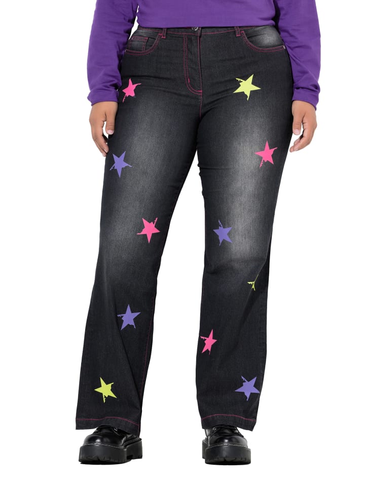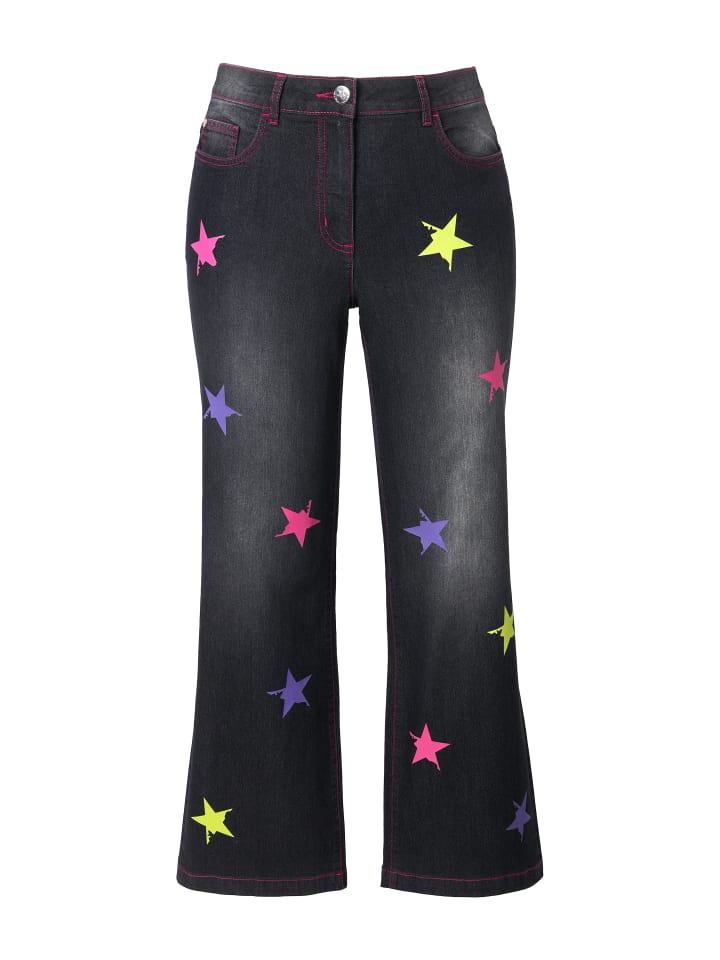 Джинсы Nora, широкие, из приятного на ощупь эластичного денима с цветными звездами. Модель с пятью карманами, пояс со шлевками для ремня, застежка на пуговицу и молнию.