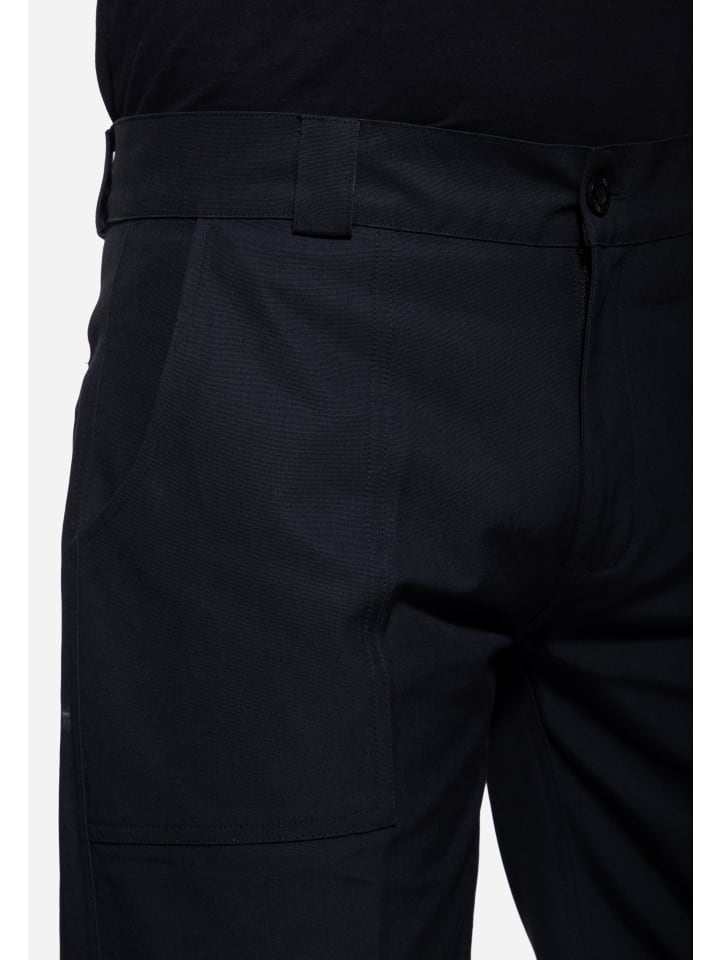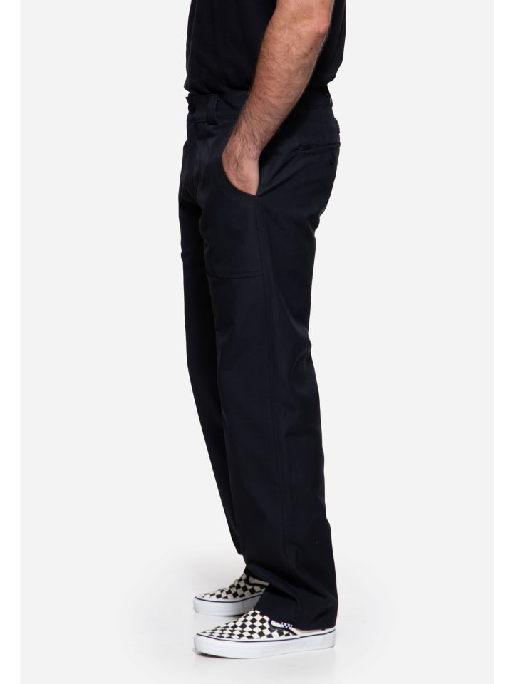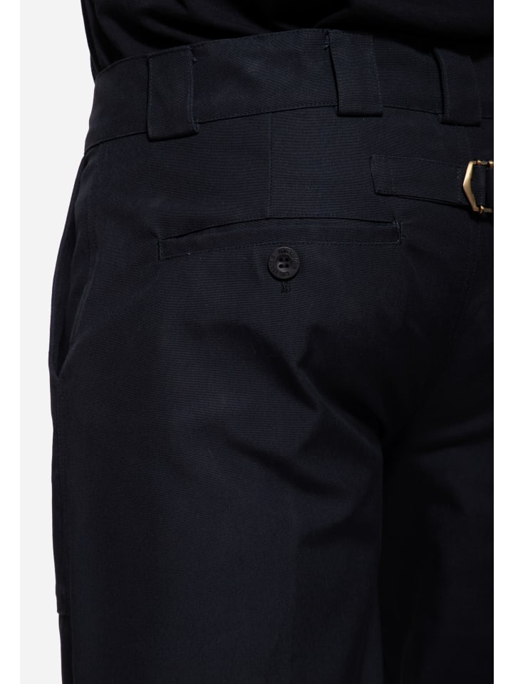 Рабочие брюки King Kerosin изготовлены из прочного парусинового материала и имеют аутентичный вид. Благодаря средней посадке и стандартному крою они удобны и свободны в носке. Выразительные складки спереди придают брюкам четкие линии и подчеркивают их рабочий характер. Накладные передние карманы, прорезные задние карманы на пуговицах и утягивающий шнурок сзади завершают образ. Универсальная вещь, которая идеально сочетается как с повседневной одеждой, так и с рабочими образами.