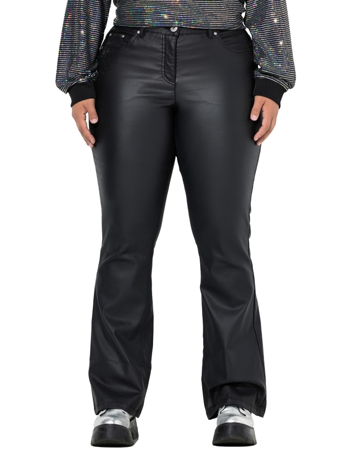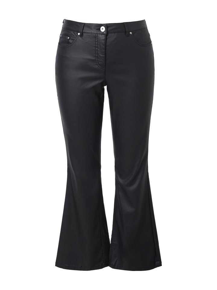 Джинсы Bootcut из эластичного денима с покрытием и клешем. Пять карманов. Эластичный пояс (от 50-го размера), шлевки для ремня, застежка на пуговицу и молнию.