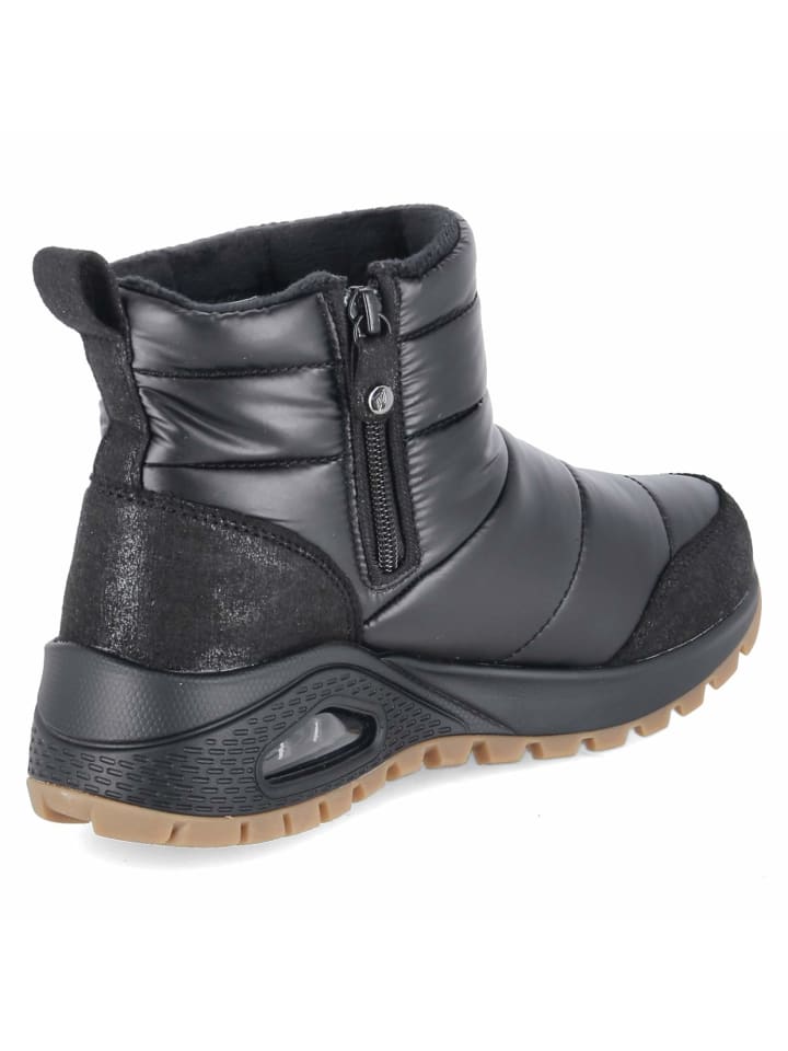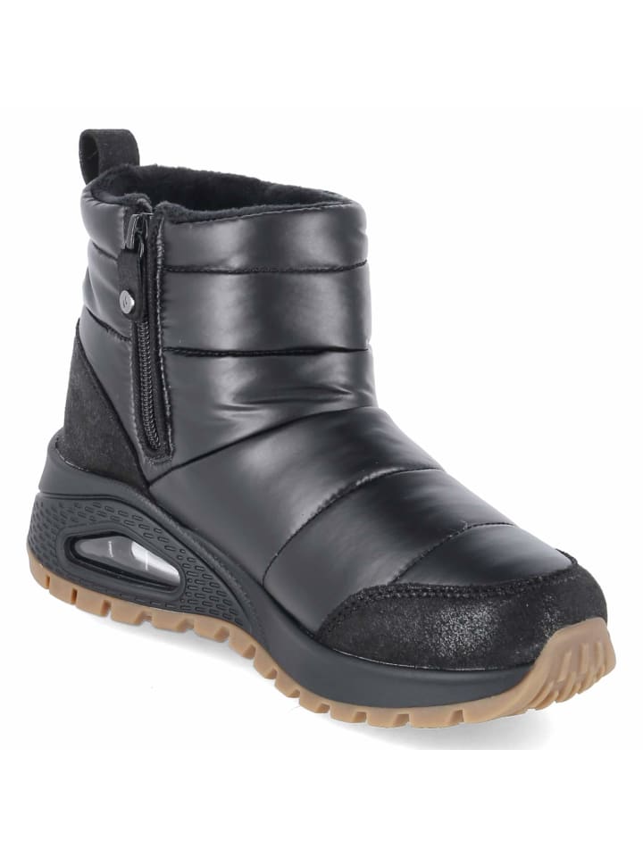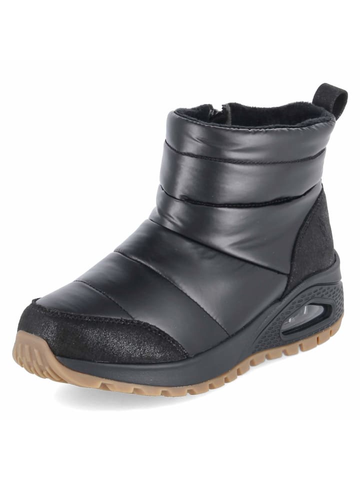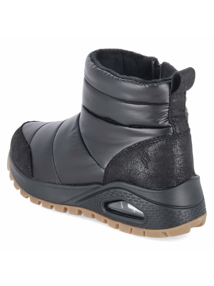 Стуканы Skechers UNO RUGGED PUFER DAZE сочетают в себе функциональные детали и гламурную отделку с металлическим золотом. Стеганый текстильный верх, мягкая теплая подкладка и стелька из пеноматериала с эффектом памяти создают ощущение комфорта с самого первого шага. Текстильная стелька, мягкий воротник и закругленная форма обеспечивают комфорт, а молния и язычок позволяют легко надевать и снимать кроссовки. Усиленные области пятки и носка обеспечивают устойчивость, а гибкая нескользящая подошва со смотровым окошком в области пятки обеспечивает надежное сцепление на зимних трассах. Эта модель соответствует размеру и идеально подходит для взрослых женщин. Модный совет: блестящие чулки, атласное платье-комбинация и свободный трикотажный кардиган создают современный микс уюта и гламура.