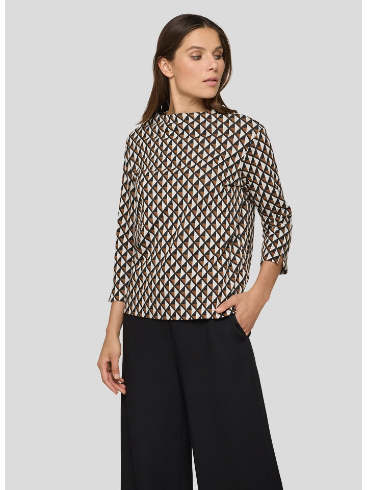 Эта рубашка с длинными рукавами, выполненная из мягкой смесовой ткани, украшена эффектным мозаичным узором в приглушенных натуральных тонах. Вырез «лодочка» добавляет женственности, а рукава три четверти создают легкий и удобный образ. Комфорт достигается благодаря эластичной вискозной смеси - идеально подходит для стильных повседневных образов. Мягкая смесовая вискоза с добавлением эластичной ткани. Вырез «лодочка». Эффектный графический дизайн по всей поверхности. Рукава три четверти создают легкий образ.
