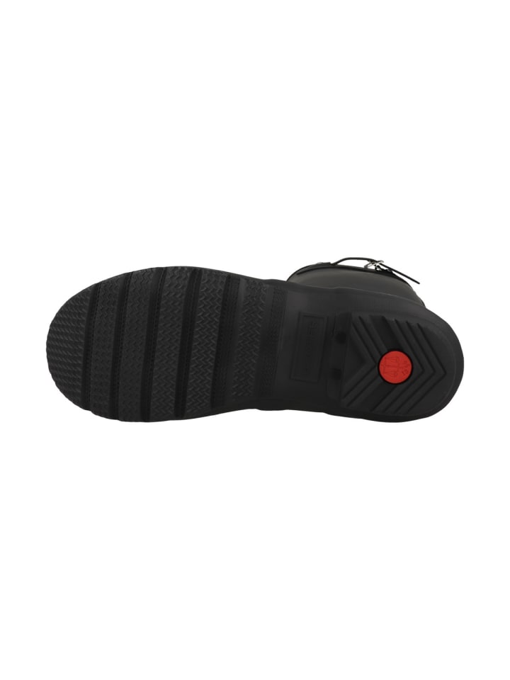 Верх из резины водонепроницаем и обладает теплоизолирующими свойствами. Подкладка и стелька изготовлены из переработанного полиэстера, что обеспечивает комфорт. Эти ботинки представляют собой современную версию культовых ботинок Hunter с пряжкой сверху. Подошва с протектором и противоскользящим покрытием не только стильно выглядит, но и обеспечивает надежную опору. Логотип бренда сверху завершает образ этих ботинок ручной работы.