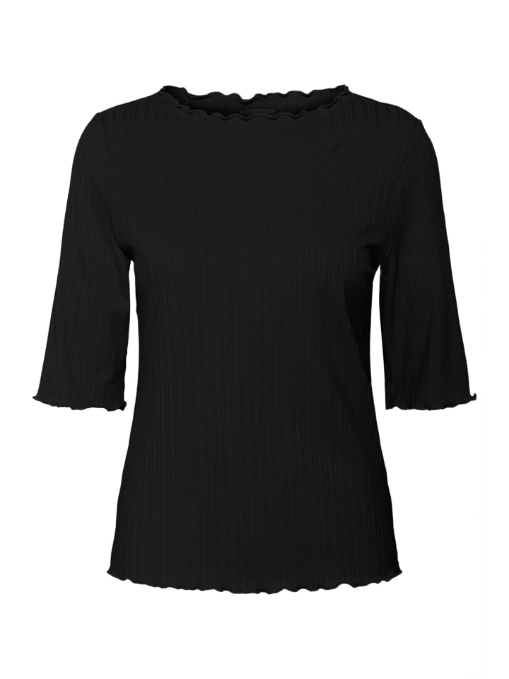 Топ в рубчик с облегающим силуэтом, волнистым круглым вырезом и фестончатыми манжетами и подолом. Текстурированный вид выглядит современно и аккуратно.