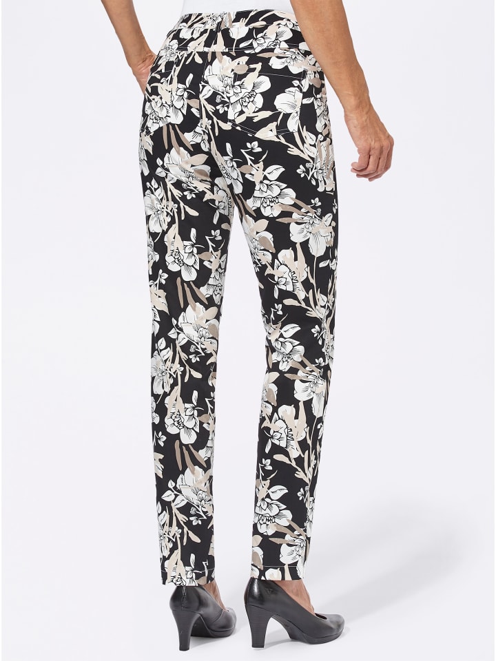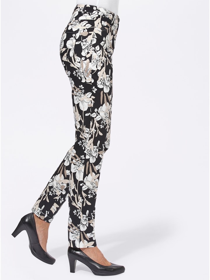 Удобные и элегантные! Брюки из мягкого, слегка мерцающего хлопкового атласа с красивым цветочным принтом. Классический крой с пятью карманами, фиксированным поясом, шлевками для ремня и застежкой на пуговицу и молнию. Длина брючины примерно 34 см.