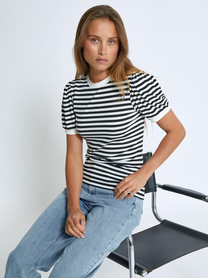 Украсьте свой повседневный гардероб полосатой футболкой MSJohanna, созданной для тех, кто ценит элегантность в повседневной одежде. Круглый вырез горловины создает классический силуэт, идеально дополняющий структурированную, но мягкую ткань, которая нежно ласкает ваше тело. Изюминкой являются искусно выполненные короткие рукава, украшенные мягкими сборками, которые добавляют объем и изысканность. Изящные ребристые детали по всей футболке подчеркивают ее обтекаемый вид, обеспечивая комфорт и воздухопроницаемость. Легко сочетайте ее с любимыми джинсами или юбкой строгого кроя, чтобы создать шикарный ансамбль, который легко перейдет как с дневного, так и с вечернего гардероба.
