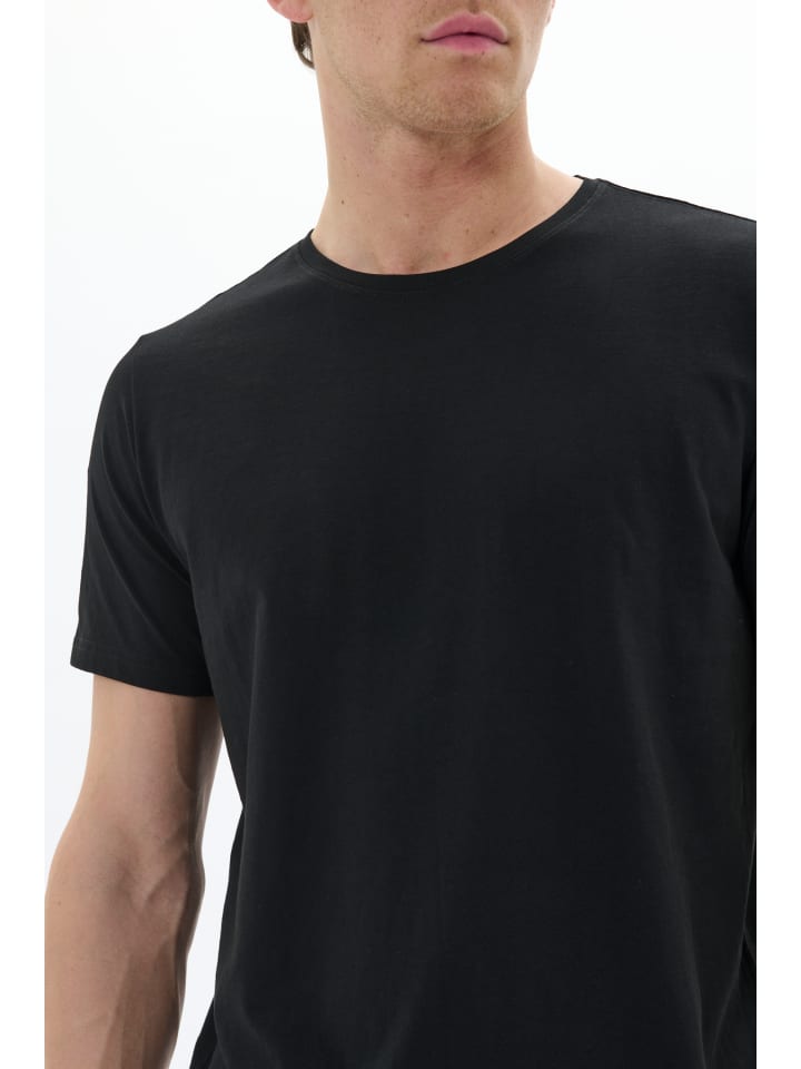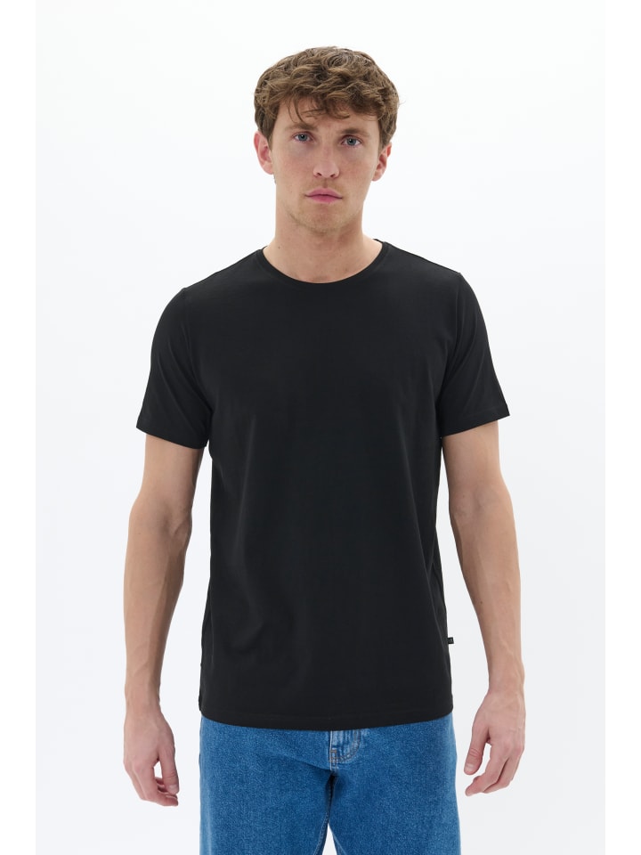 Классическая футболка с круглым вырезом, прямым кроем и короткими рукавами. Минималистичный образ для вневременного современного стиля.