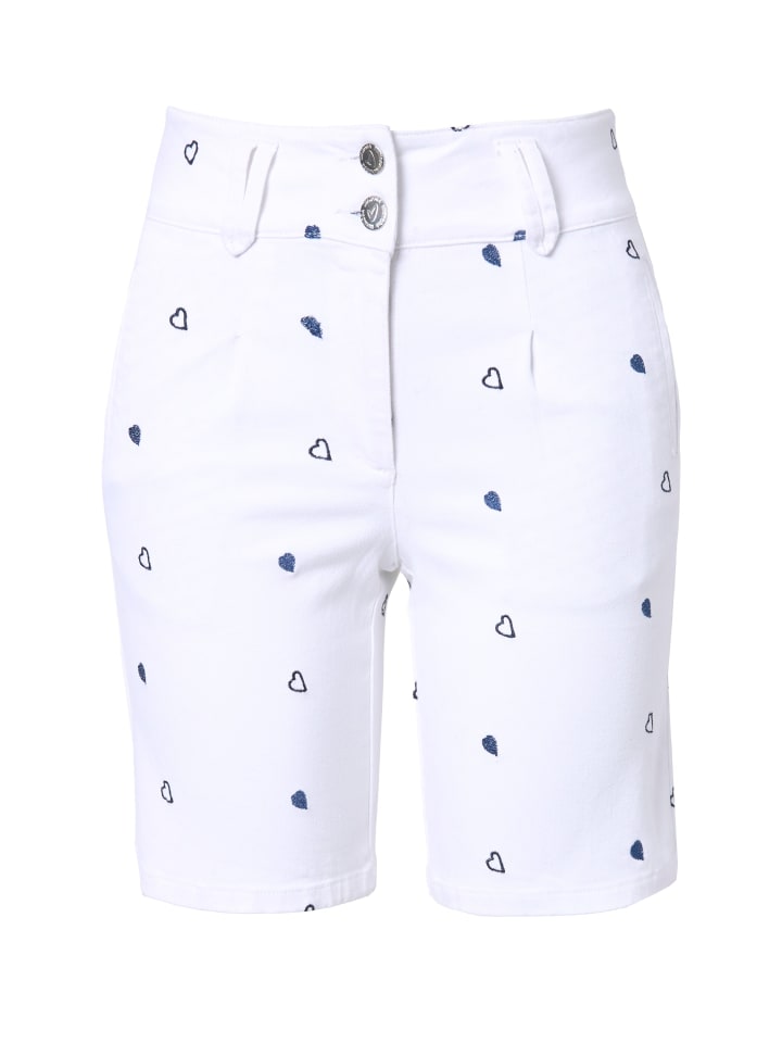 Джинсовые шорты прямого кроя из эластичного денима с вышивкой в виде сердечек. Пояс со шлевками для ремня. Застежка на пуговицу и молнию. 4 кармана.