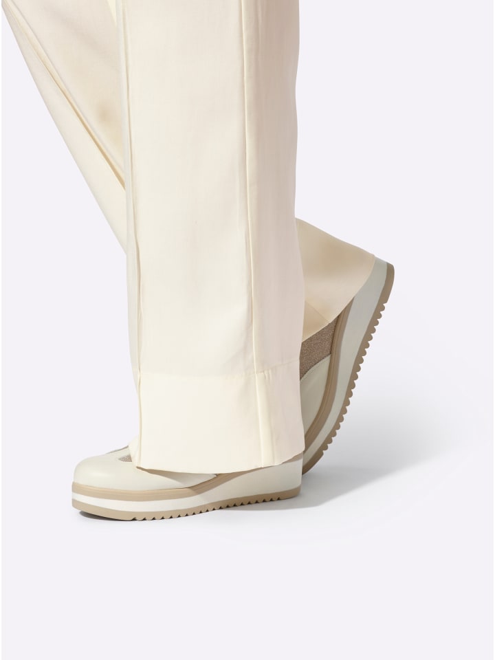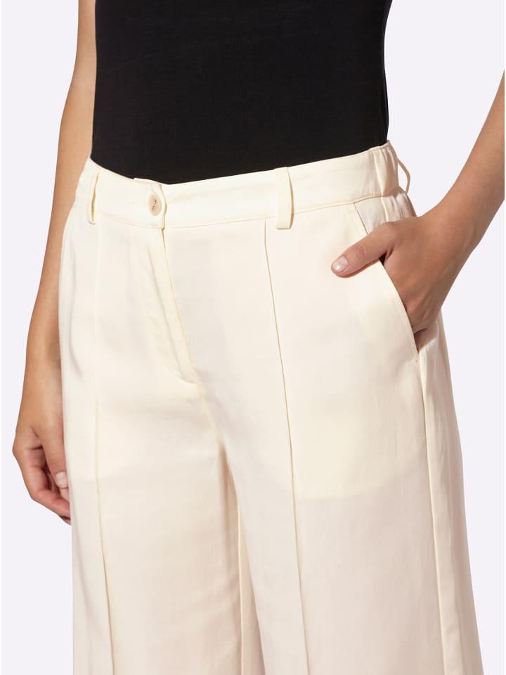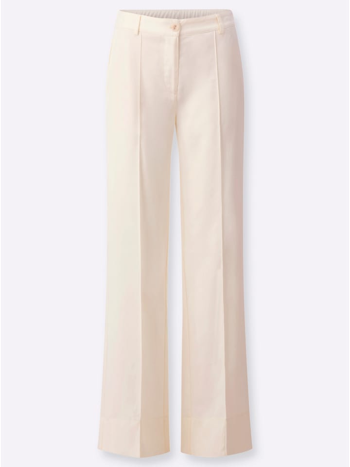 Брюки в модном стиле с боковыми карманами и имитацией задних карманов. Широкие прямые брюки с визуально удлиняющими складками и эластичным поясом сзади. Стандартная посадка. Комфортная посадка. Ширина брючины примерно 60 см.