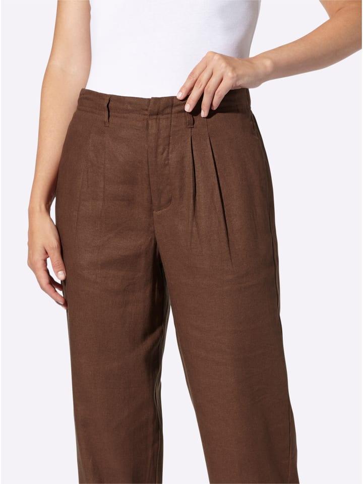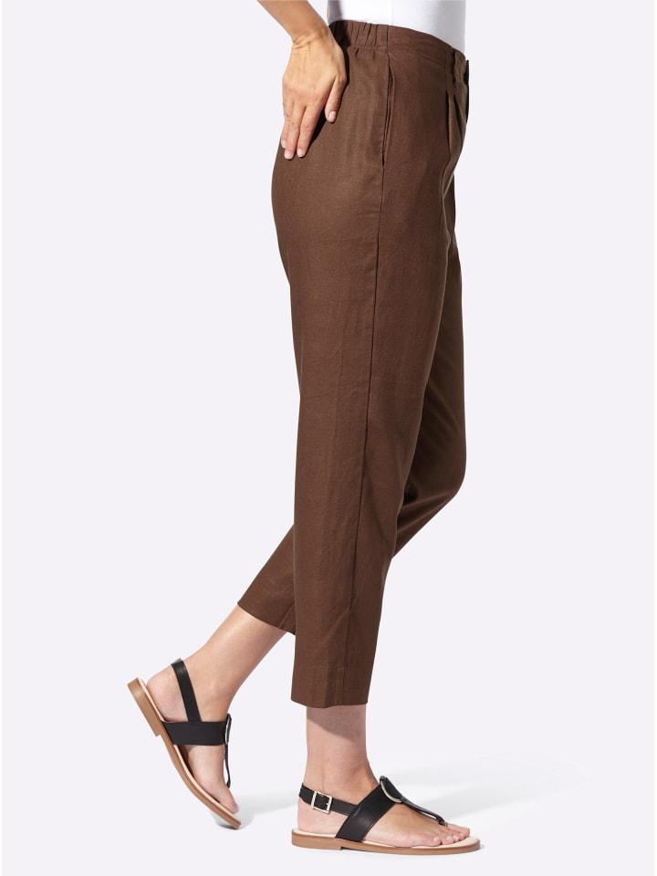 Брюки: Удобный, универсальный фасон, модная длина 7/8, из воздушной льняной ткани. Застежка на крючок, эластичный пояс сзади, складки и боковые карманы. Высокая посадка. Комфортная посадка. Ширина брючины примерно 38 см.