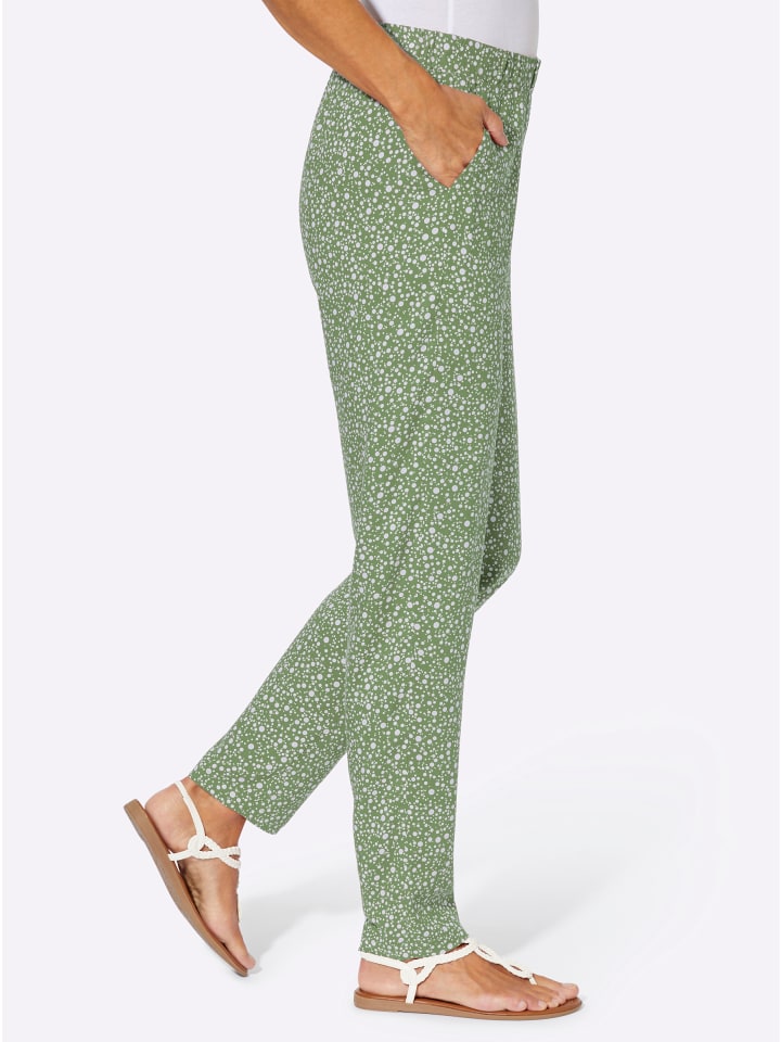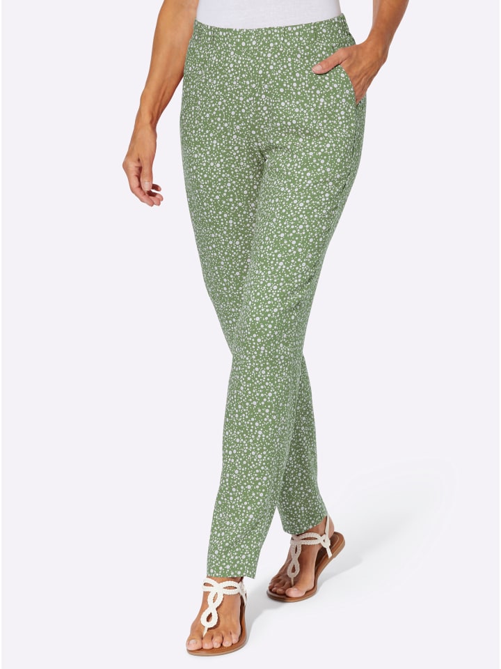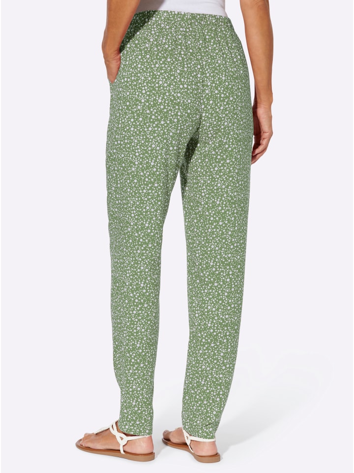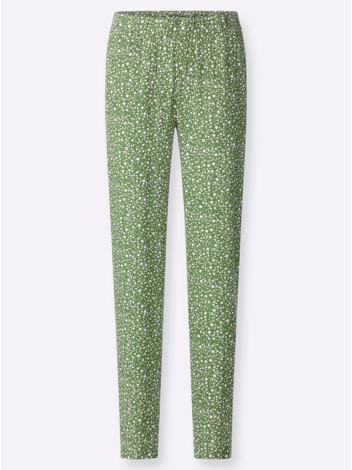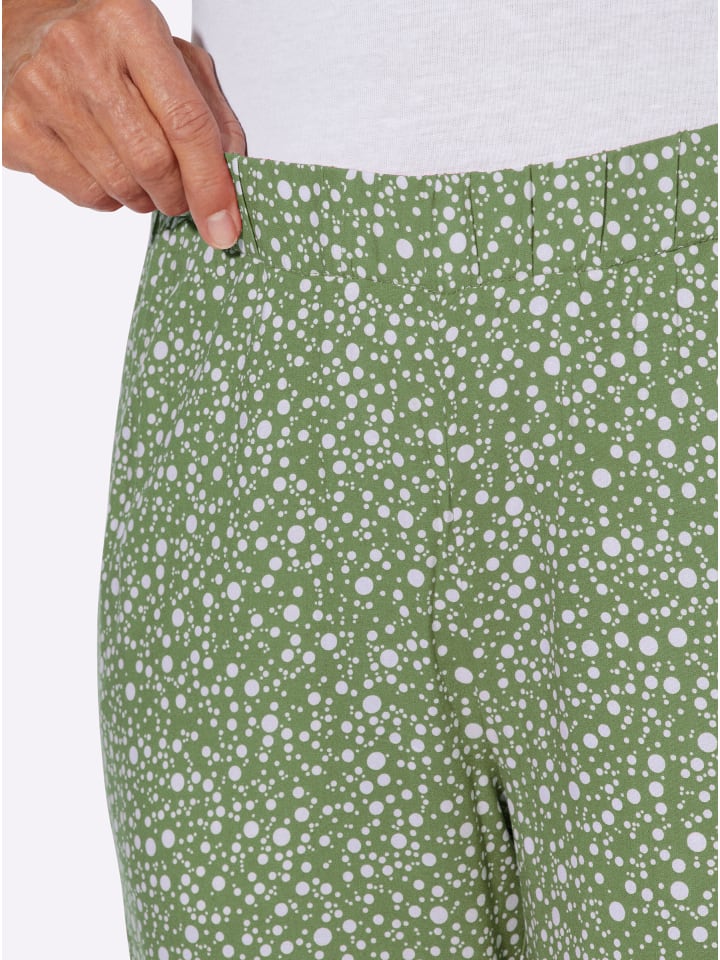Стильный хит! Эти удобные брюки из мягкой, струящейся вискозы с горошком разного размера привлекают внимание. Удобный эластичный пояс и практичные карманы. Длина брючины примерно 34 см.