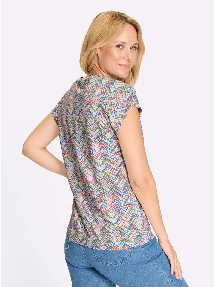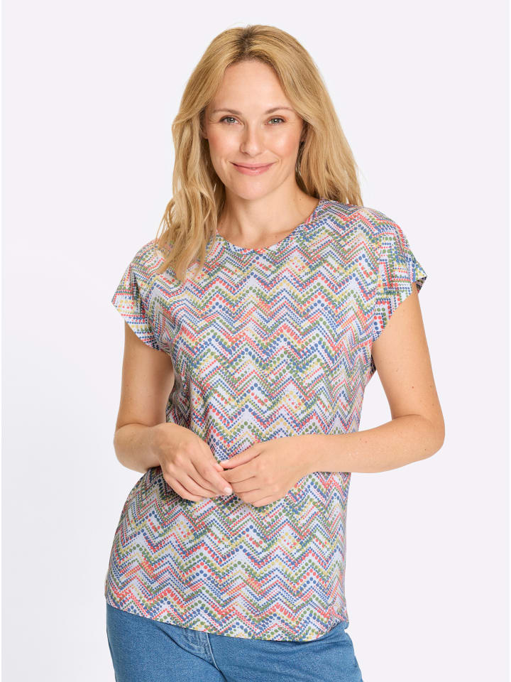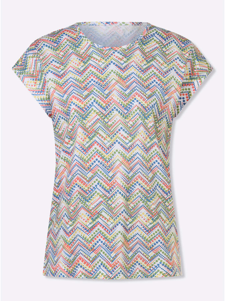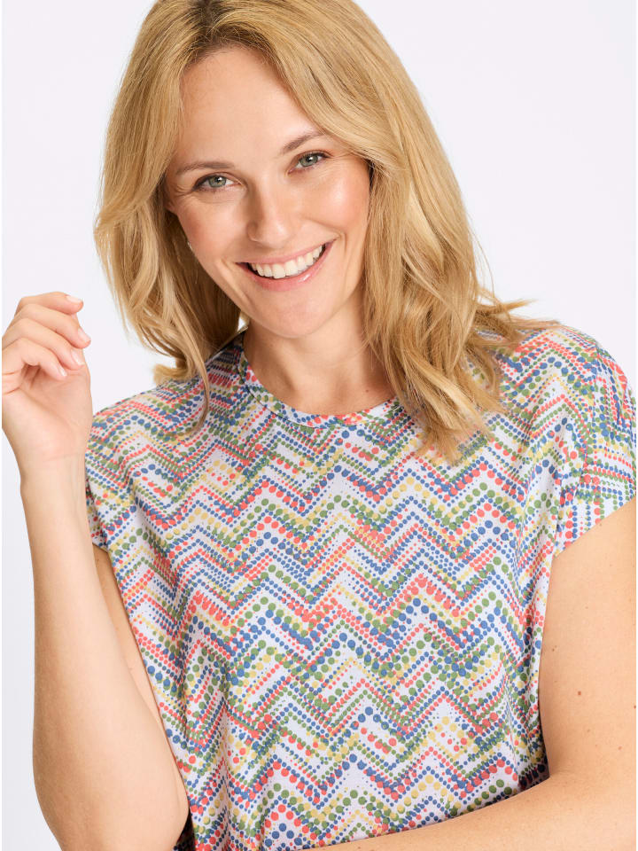 Футболка с принтом в виде красочного зигзагообразного узора из множества мелких точек - все на приятном для кожи хлопке. Наш вердикт: любовь с первого взгляда! Спущенное плечо.