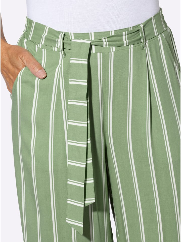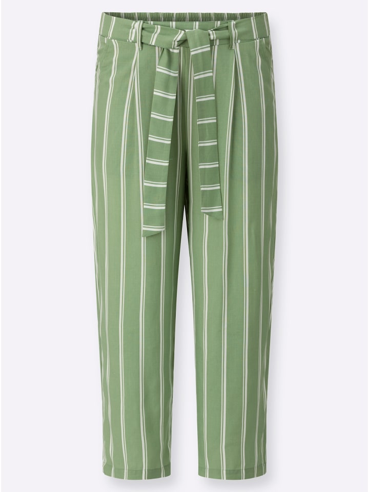 Дерзкая длина, мягкая и воздушная ткань, свежий полосатый рисунок: эти брюки длиной 3/4 - просто летняя вещь! Эластичный пояс сзади, шлевки для ремня и завязывающийся пояс. Складки на поясе обеспечивают элегантный вид и удобную посадку. Два передних кармана. Длина брючины около 49 см. Изготовлены из вискозы Lenzing ECOVERO.