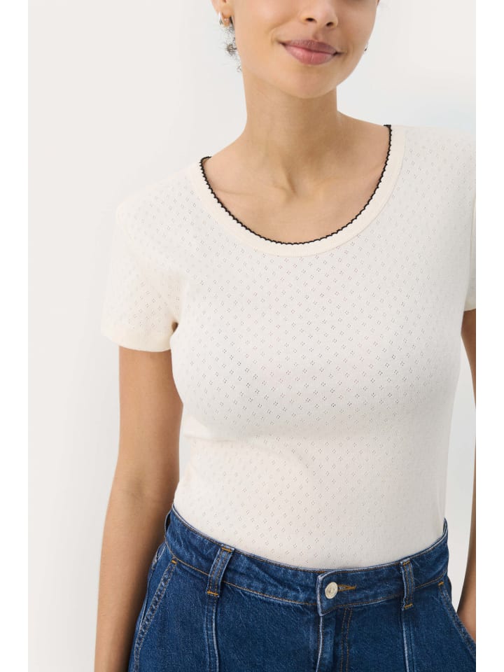 Эта приталенная футболка имеет круглый вырез с едва заметным зубчатым краем, короткие рукава и мягкую текстуру.