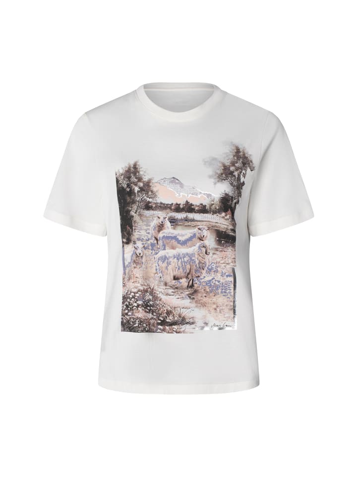 Эта футболка Marc Cain с ярким принтом, украшенным стразами, и мягким хлопком идеально отражает повседневную элегантность и является стильным акцентом.