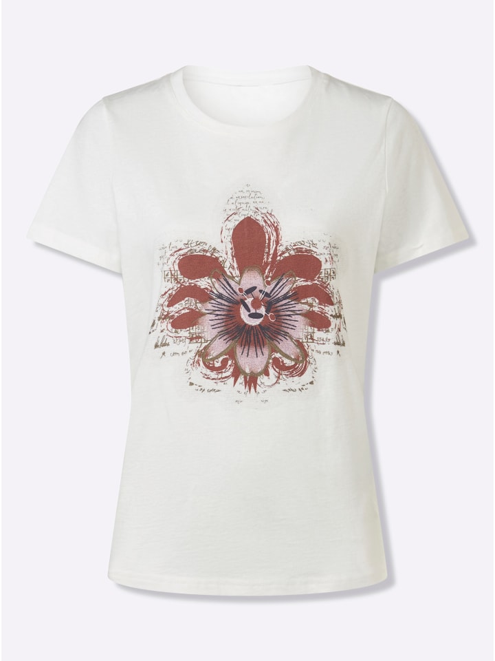 Эта футболка украшена эффектным цветочным принтом спереди. Круглый вырез и короткие рукава. Сертифицировано GOTS.