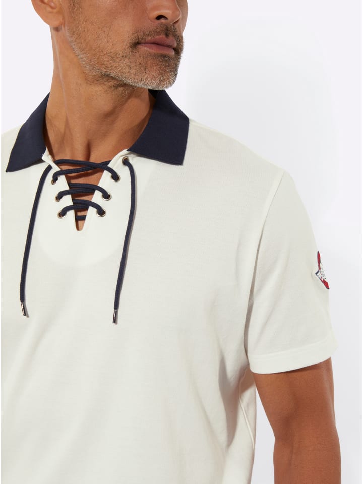 Рубашка-поло с короткими рукавами, контрастным ребристым воротником и контрастным шнурком на открытом V-образном вырезе с люверсами. Декоративная аппликация на рукаве. Изготовлена из приятной пике.