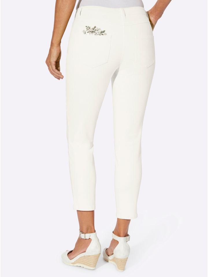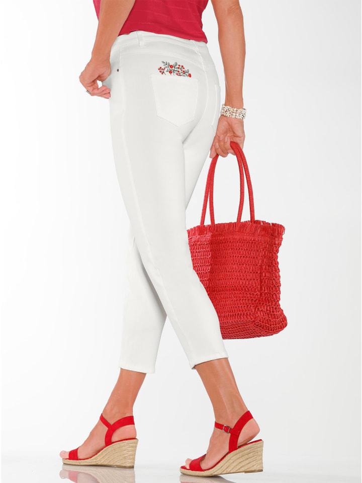 Эти брюки длиной 7/8 привлекают внимание цветочной вышивкой на одном из двух накладных задних карманов. Они имеют фигурный пояс со шлевками для ремня и застежкой на пуговицу и молнию спереди. Два передних кармана и дополнительный карман для монет. Сзади брюки имеют притачную кокетку. Они соответствуют инициативе «Хлопок, сделанный в Африке». Длина брючины около 32 см. Ремень в комплект не входит.