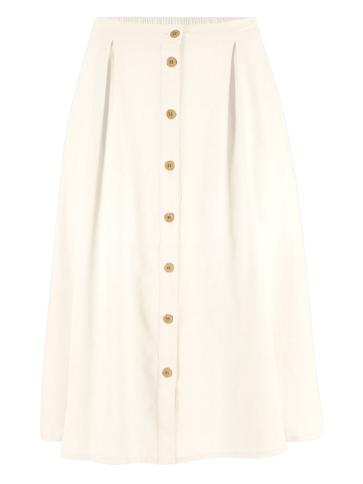 Удобная юбка из смеси хлопка и льна с красивым струящимся силуэтом благодаря складкам на поясе спереди. Внутренняя застежка на пуговицы спереди и внутренний эластичный пояс сзади для дополнительного комфорта. Практичные карманы в боковых швах. Планка с пуговицами по всей длине спереди с мраморными пуговицами. Цвет экрю с непрозрачной подкладкой. Поддерживает инициативу «Сделано в Африке» с хлопком.