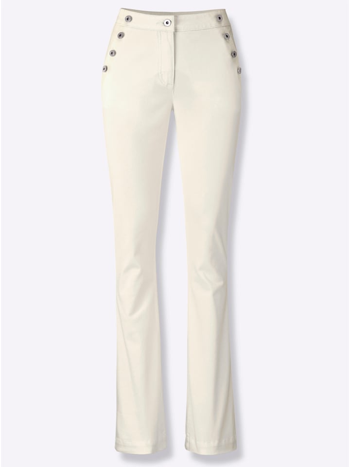 Эластичные, удобные джинсы свободного, слегка расклешенного кроя с удлиненными штанинами. Контурный пояс и застежка на пуговицу и молнию. Броские металлические декоративные пуговицы на скошенных передних карманах. Приталенная кокетка и накладные карманы сзади. Контрастная строчка завершает образ. Поддерживает инициативу «Сделано в Африке» (Catton made in Africa). Длина брючины примерно 48 см. Ремень в комплект не входит.