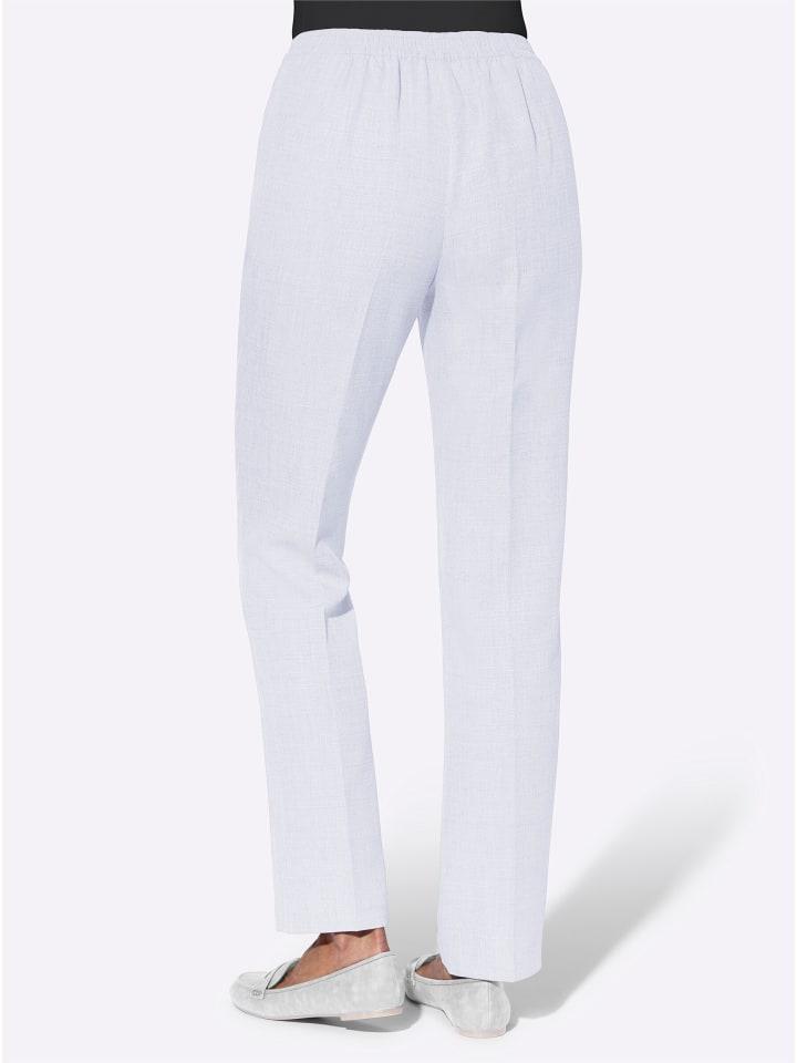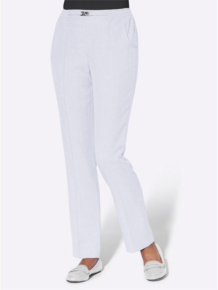 Брюки с застежкой из изысканного льна. Удобный фасон с эластичным поясом, гладкая передняя панель с декоративной пряжкой. Боковые карманы. Защипы спереди, заутюженная складка сзади. Ширина брючины: примерно 38 см.