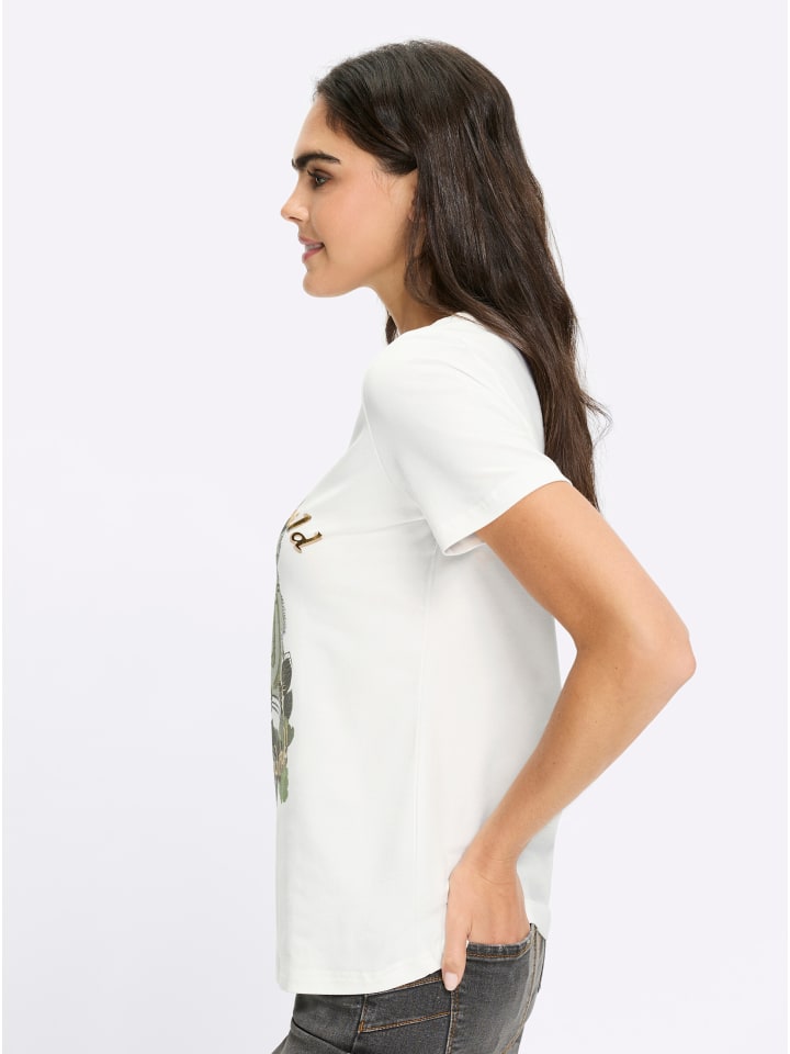 Рубашка: Экстравагантное сочетание тигрового принта и тиснения фольгой. Круглый вырез горловины и короткие рукава. Сертификация GOTS