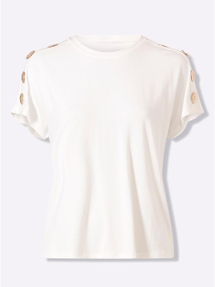 Мягкая, струящаяся футболка из вискозы Lenzing ECOVERO. Круглый вырез и спущенная линия плеча. Короткие рукава с крупными декоративными пуговицами золотистого цвета.