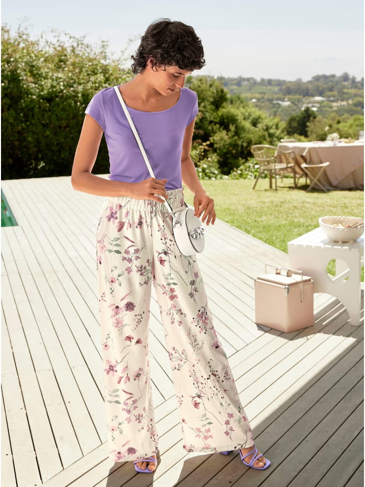 Идеальное сочетание модного внешнего вида и максимального комфорта! Модные брюки с широкими штанинами и цветочным принтом, удобной посадки, с оборками на высоком эластичном поясе. Изготовлены из приятного, легкого в уходе крепа. Длина брючины примерно 62 см.