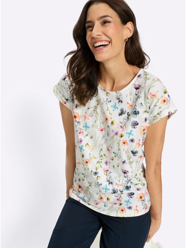 Эта футболка с принтом из летней пряжи с утолщениями воплощает все многообразие цветущего летнего луга в великолепном цифровом принте. У нее круглый вырез горловины, спущенные плечи и отвороты на манжетах. Футболка поддерживает инициативу «Хлопок, сделанный в Африке».