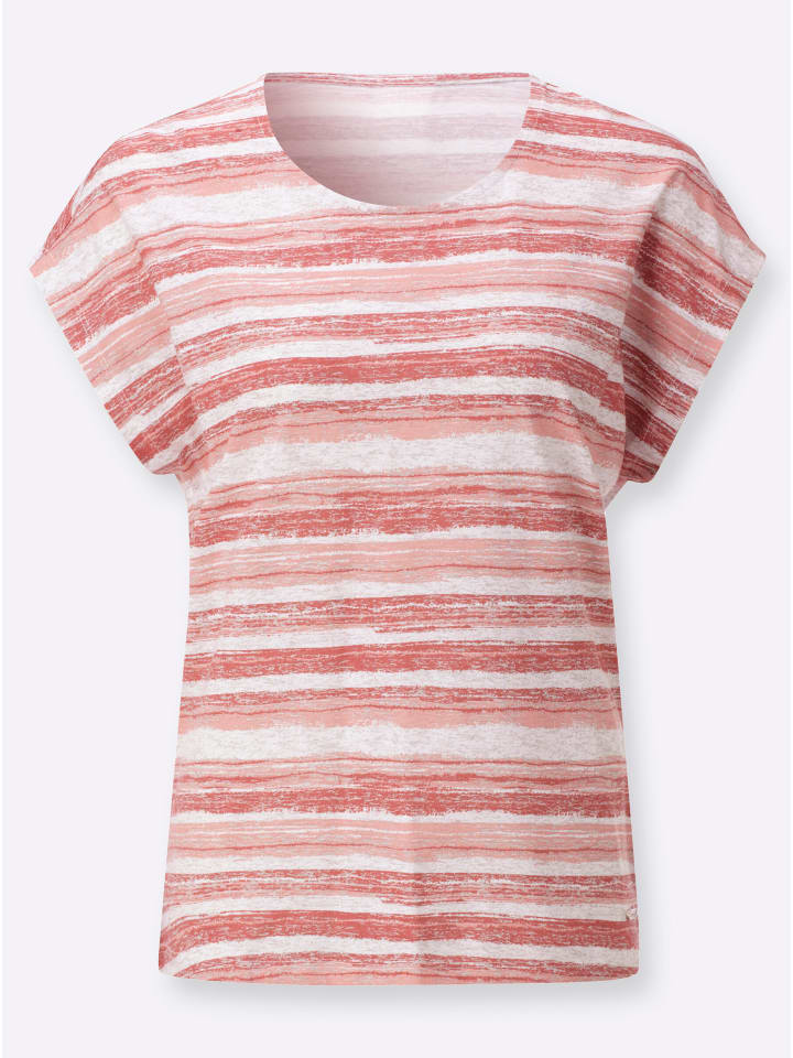 Эта рубашка с принтом удобна в носке и украшена стильными полосками! Круглый вырез горловины и спущенные плечи. Сертифицировано OCS.