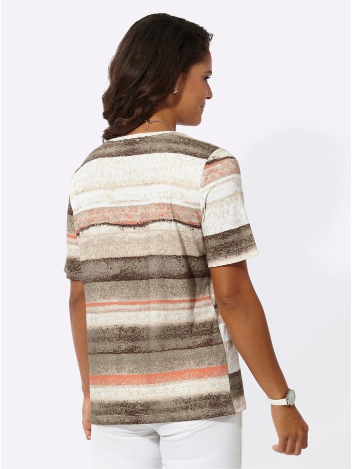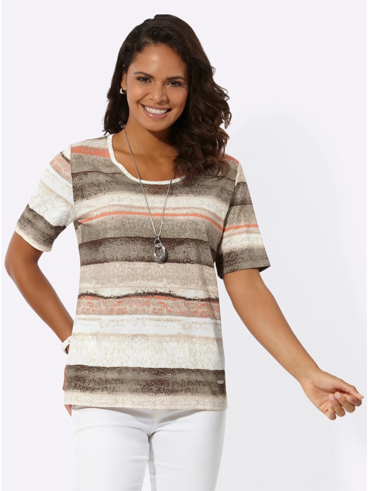 Эта рубашка впечатляет своим принтом в тон, подобранным по цвету, на невероятно мягком смесовом материале. Круглый вырез горловины, короткие рукава и прямой подол.