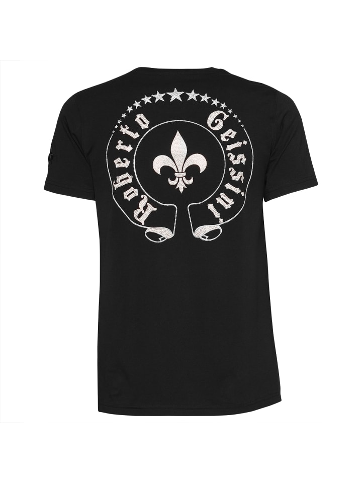 Вышитая геральдическая лилия на левом рукаве, нашивка из высококачественной искусственной кожи с заклепкой в виде серебряного черепа на правом рукаве и нашивка с логотипом Roberto Geissini на левом плече.