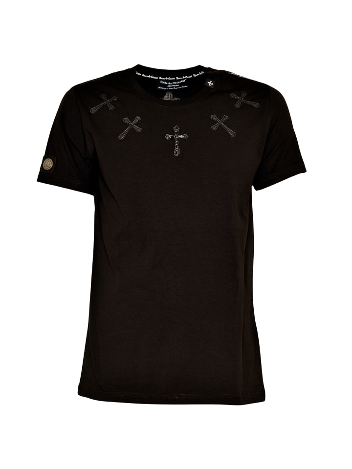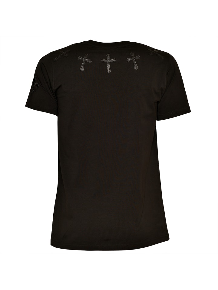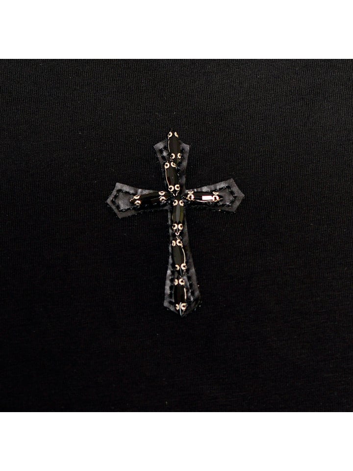 Спереди футболка украшена четырьмя нашитыми крестами из кожи, а также одним блестящим роскошным крестом в центре с искусно закрепленными металлическими декоративными камнями.