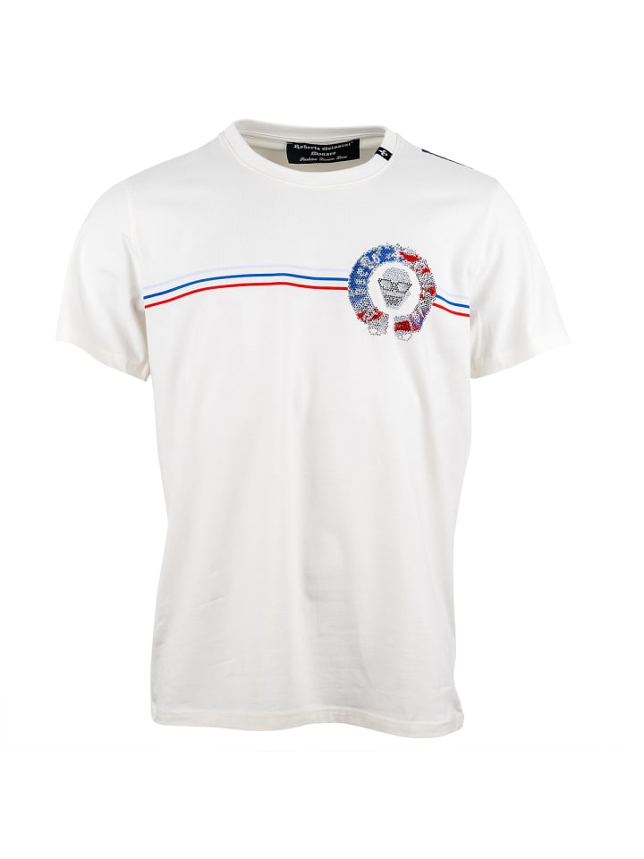 Эта стильная мужская футболка «France» воплощает роскошь, жизнерадостность и стиль одновременно. Улыбающийся логотип черепа Roberto Geissini, украшенный серебристыми, синими, красными и черными стразами, придает футболке неповторимый блеск.