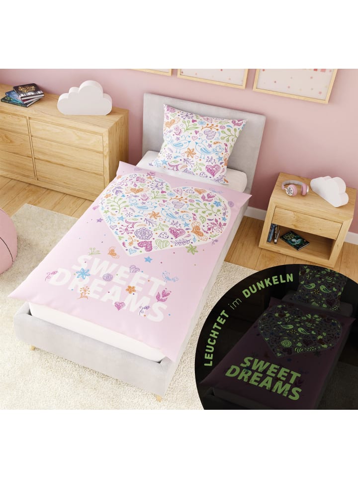Это детское постельное белье размером 135x200 см, будучи совершенно особенной изюминкой и притягивая взгляды, светится в темноте, создавая особенно гармоничную атмосферу. Эффект свечения должен быть усилен естественным или искусственным освещением. Чем дольше/интенсивнее зарядка, тем сильнее эффект.