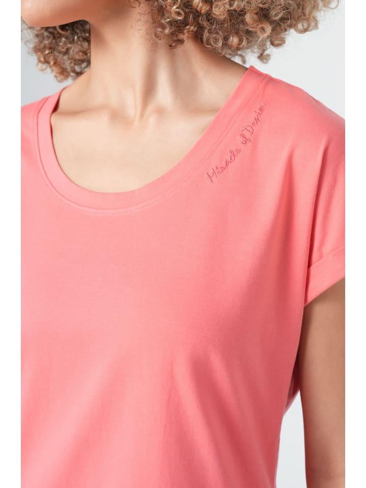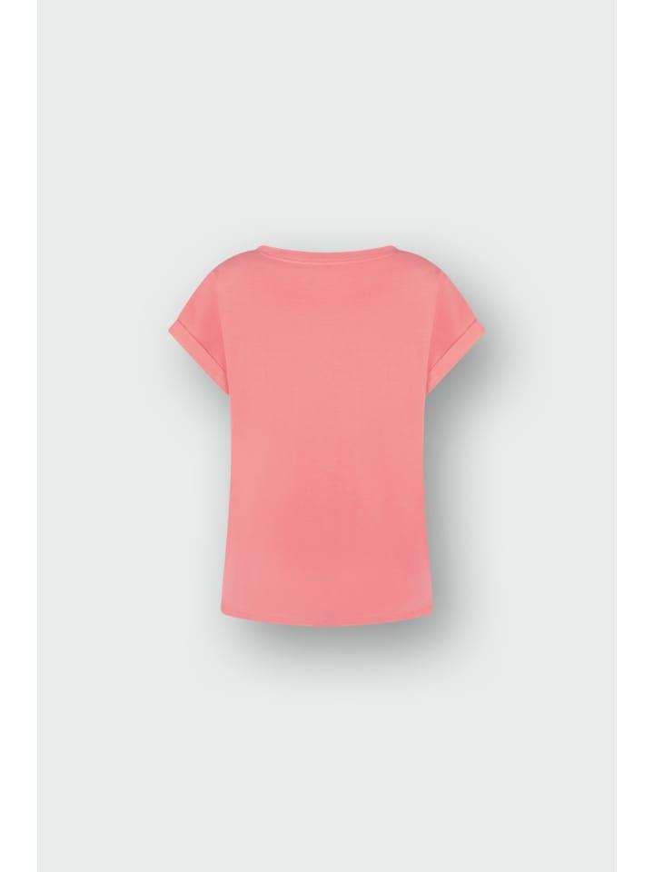 Женская футболка розового цвета - сияющий коралл для солнечных дней Эта футболка цвета «закатный коралл» - абсолютный must-have для вашего летнего гардероба. Теплый коралловый оттенок мгновенно поднимет настроение и добавит свежести вашему образу. Изготовленная из высококачественной смеси 95% хлопка и 5% эластана, она обеспечивает оптимальный комфорт и приятную эластичность. Хлопок обеспечивает мягкость на ощупь и хорошую воздухопроницаемость, а содержание эластана обеспечивает идеальную посадку и свободу движений. Непринужденная изысканность в сочетании с универсальностью стиля Эта футболка впечатляет своим свободным женственным кроем и короткими, слегка закатанными рукавами, которые придают этой базовой вещи особый шарм. Мягкий круглый вырез горловины изящно подчеркивает фигуру, а прямой, слегка свободный крой обеспечивает комфортное ощущение. Гладкая спинка без дополнительных деталей подчеркивает чистый вид. Сочетайте футболку цвета «закатный коралл» с белыми брюками для свежего летнего образа или с джинсами для повседневного стиля. Мягко струящаяся ткань нежно облегает фигуру и создает современный, неподвластный времени образ. Высококачественная пошив с аккуратными швами и аккуратной отделкой рукавов и подола гарантирует долговечность и сохранение формы даже после многократных стирок - универсальный фаворит для множества образов. Состав: 95% хлопок, 5% эластан.