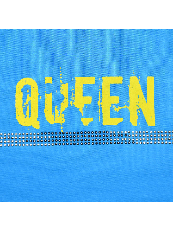 Крупная, красочная надпись «WILD AND FREE», а также «QUEEN» и другие украшения на футболке щедро украшены цветными роскошными стразами.