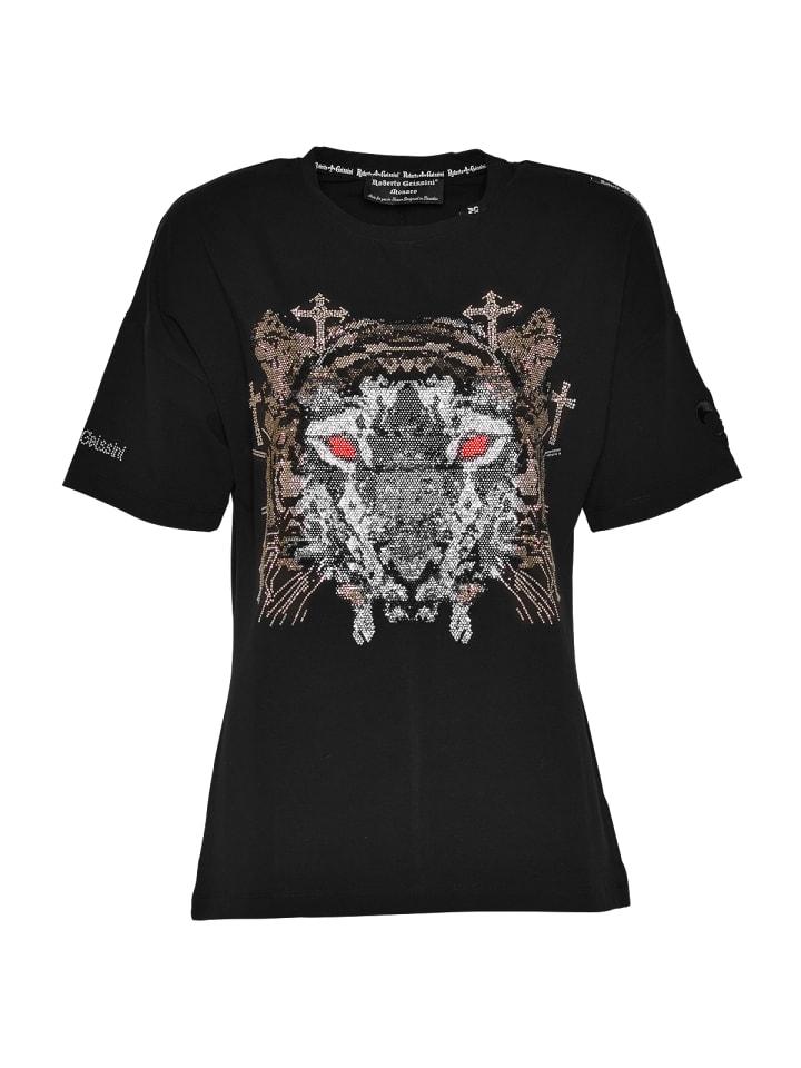 Вы гарантированно будете выглядеть ослепительно в этой блестящей футболке с рисунком тигра и креста, щедро украшенным стразами.