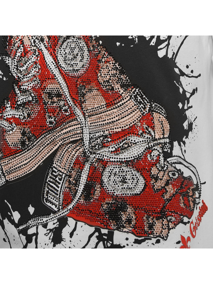 Женская футболка с классическими красными спортивными кроссовками и рисунком черепа в стиле Роберто Гейссини.