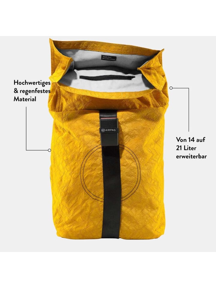 Основное отделение застегивается на прочную пряжку, которая не только круто выглядит, но и особенно проста в использовании. Благодаря практичной застежке-рулону его объем можно увеличить с 14 до 21 литра при необходимости. Это делает рюкзак гибким спутником для повседневной жизни или путешествий. Мягкое отделение для ноутбука безопасно хранит 15-дюймовые устройства. Кроме того, продуманная конструкция внутренних отделений и боковой карман обеспечивают дополнительную организацию. Если вам нужно быстро что-то достать, содержимое можно легко найти через отверстие для быстрого доступа спереди. Удобная мягкая задняя панель и мягкие плечевые ремни обеспечивают комфортную переноску в дороге. Кроме того, благодаря практичному багажному ремню рюкзак легко надевается на телескопическую ручку чемодана, что делает поездку комфортной. Внутренняя часть Airpaq Rolltop изготовлена из неокрашенного материала, используемого для подушек безопасности, с высоким содержанием переработанных материалов и, следовательно, особенно экологична. Компания также награждает рюкзак призом.