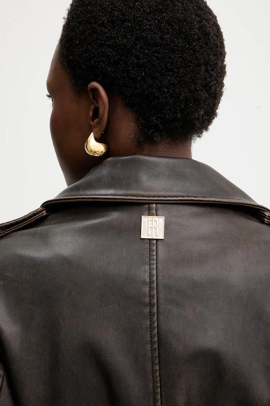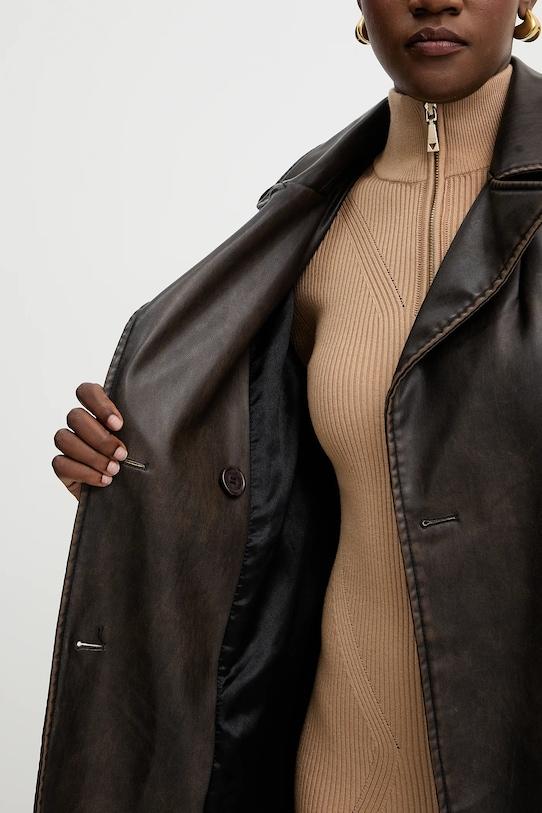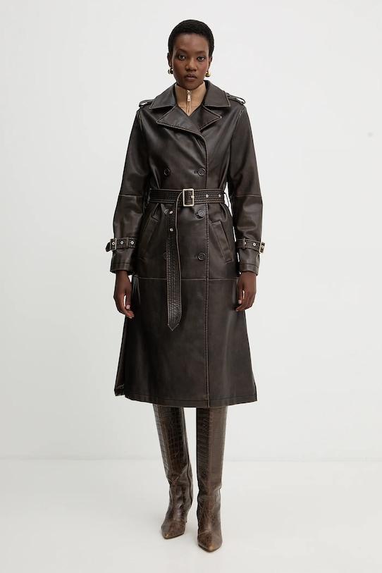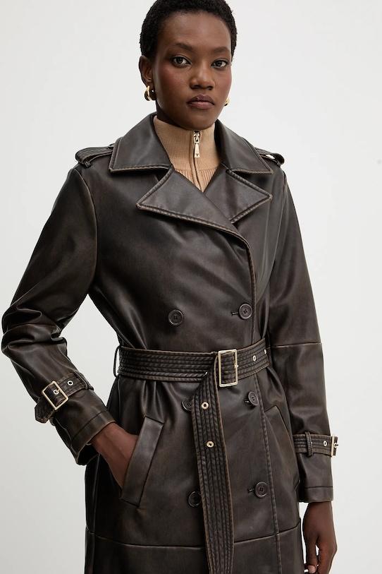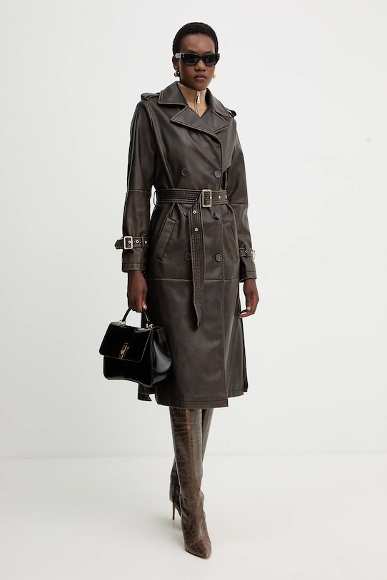 Пальто из коллекции Fracomina. Модель без подкладки выполнена из искусственной кожи. Эта модель выполнена из исключительно мягкого материала. - Простой дизайн, не стесняющий движений. - Двубортный пиджак с застежкой на пуговицы. - Ремешок из эко-кожи в комплекте. - Внешние накладные карманы. - Классические лацканы. - Дополнительный слой материала в виде подкладки. - Погоны на плечах. - Длина рукава: 63 см. - Длина: 114 см. - Ширина под мышками: 45 см. - Ширина плеч: 40 см. - Размеры указаны для размера: S.