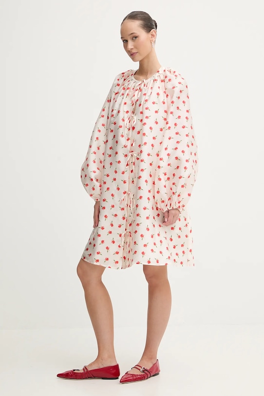 Это платье из коллекции Stine Goya выполнено из ткани с рисунком. Полиэстер обеспечивает повышенную устойчивость к сминанию. - Изделие содержит переработанные волокнистые материалы. - Дополнительный слой материала в виде подкладки. - Расклешенный крой. - Декоративная окантовка по вырезу горловины. - Рукава реглан благодаря своей конструкции обеспечивают большую свободу движений. - Рукава отделаны узкой эластичной манжетой. - Модель с декоративными завязками. - Длина рукава (от горловины): 68 см. - Длина: 92 см. - Ширина под мышками: 63 см. - Размеры указаны для размера: S.