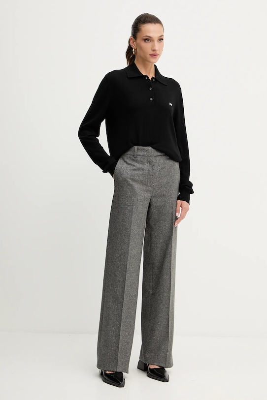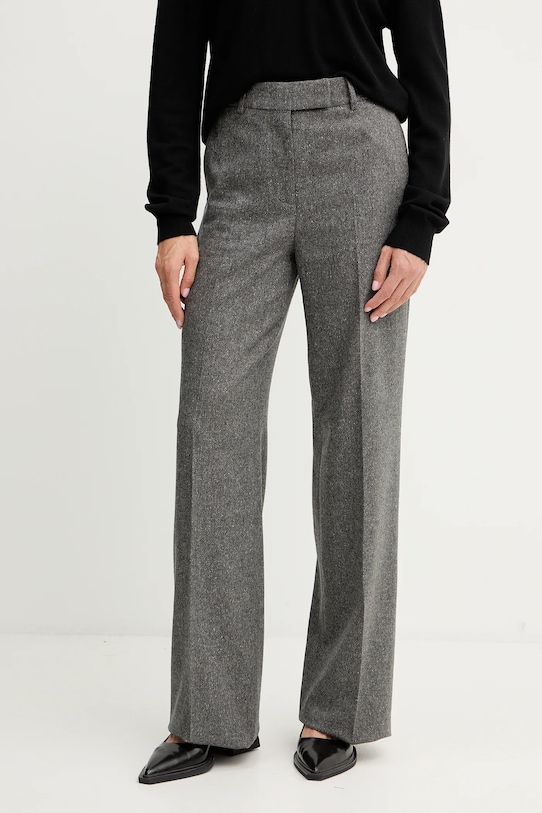 Брюки из коллекции Iceberg выполнены из меланжевой ткани. Высокое содержание шерсти обеспечивает защиту от холода, а добавление полиамида увеличивает износостойкость изделия. - Простой дизайн, не стесняющий движений. - Модель с высокой талией, застежкой на молнию, пуговицы и крючок. - Два боковых накладных кармана. - Два накладных кармана на ягодицах. - Штанина отутюживается в складку. - Ширина талии: 35 см. - Ширина бедер: 44 см. - Высота талии: 30 см. - Ширина штанины внизу: 27 см. - Ширина штанины: 29 см. - Длина по внутреннему шву: 86 см. - Размеры указаны для размера: 34.