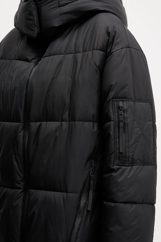 - Высокий воротник и съемный капюшон обеспечивают дополнительную защиту от холода.