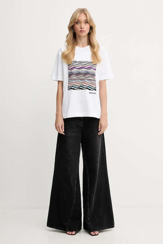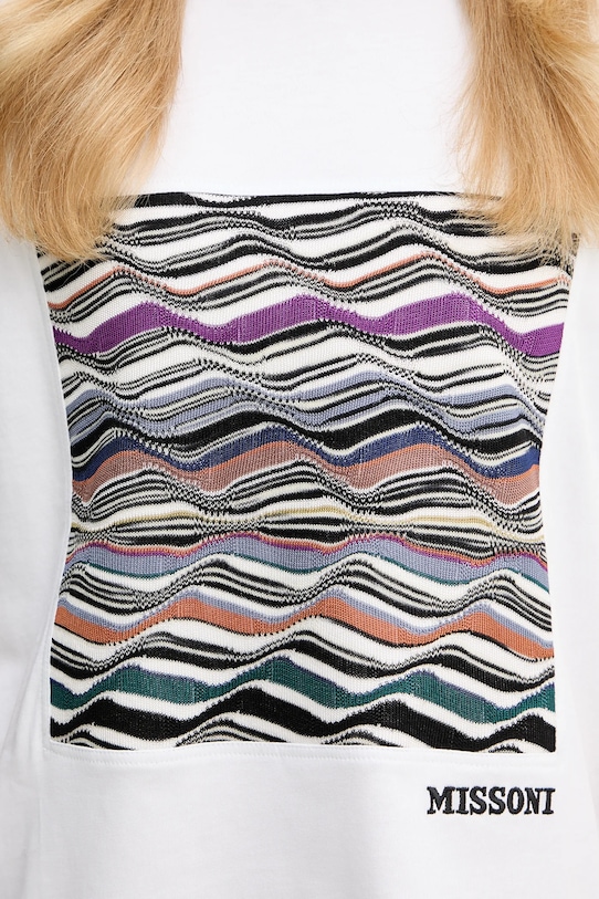 Эта футболка из коллекции Missoni выполнена из тонкой, эластичной ткани на основе дышащего хлопка. - Свободный крой, обеспечивающий полную свободу движений. - Круглый ребристый вырез. - Короткий рукав. - Крой рукава со спущенной линией плеча не ограничивает подвижность. - Модель с декоративной вышивкой. - Длина: 68 см. - Ширина под мышками: 52 см. - Размеры указаны для размера: S.