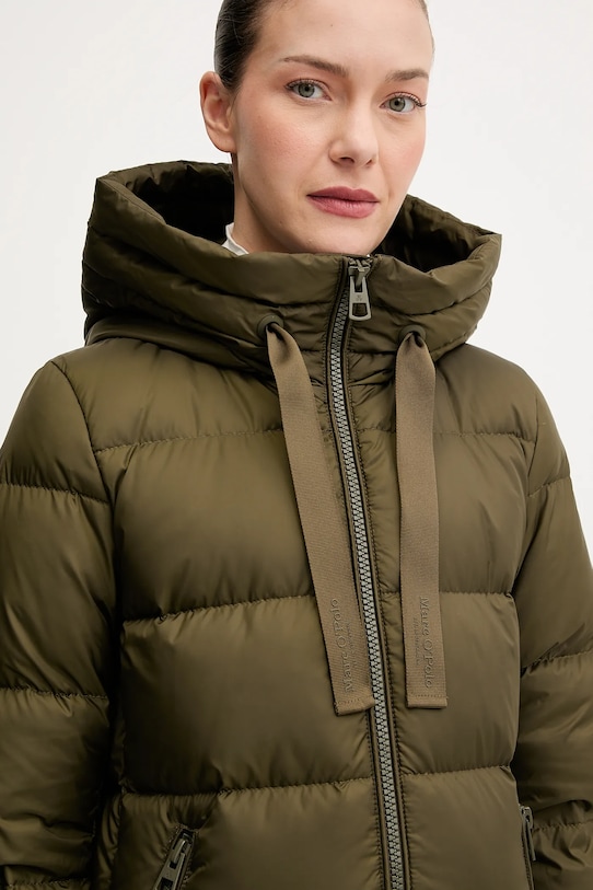 Эта утеплённая куртка из коллекции Marc O'Polo выполнена из гладкой ткани. Стёганая конструкция с наполнителем из натурального пуха гарантирует высокий уровень защиты от холода. - Наполнитель из натурального переработанного пуха, произведен в соответствии с сертификацией RDS (Responsible Down Standard). - Простой дизайн, не стесняющий движений. - Поднятый воротник и несъемный капюшон обеспечивают дополнительную защиту от холода. - Внешние карманы на молнии. - Рукава отделаны удобными эластичными манжетами. - Длина рукава: 63 см. - Длина: 108 см. - Ширина под мышками: 50 см. - Ширина плеч: 40 см. - Размеры указаны для размера: 36.