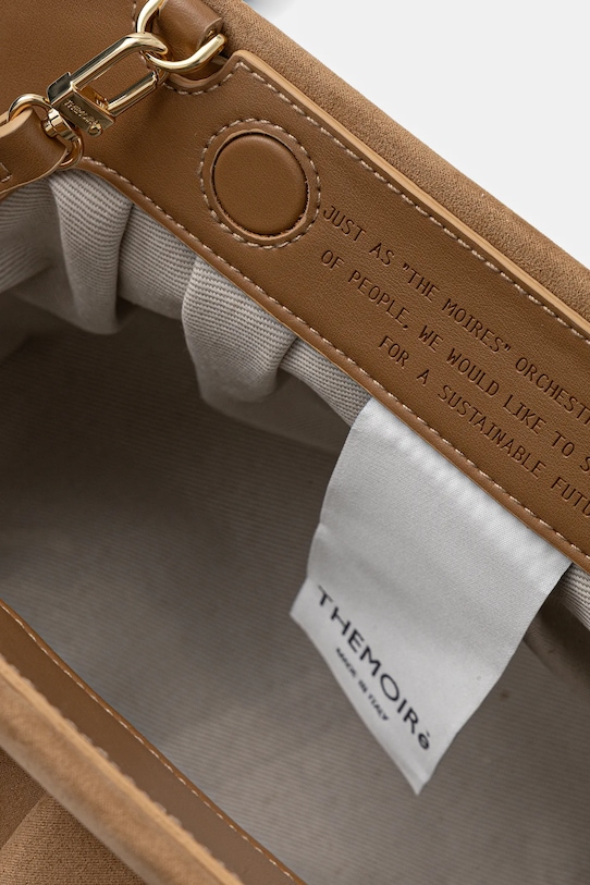 Сумка среднего размера из коллекции Themoire. Изготовлена из искусственной замши. THEMOIRè - итальянский бренд, стремящийся создавать экологичную моду. Они производят сумки и аксессуары из инновационных, экологичных материалов, таких как волокна листьев ананаса, яблочные отходы, пробка, рафия и переработанные материалы (например, пластиковые бутылки и рыболовные сети). Бренд стремится минимизировать свое воздействие на окружающую среду и продвигать этичное производство. - Съемный регулируемый ремешок. - Входящий в комплект тканевый чехол защищает изделие от пыли. - Магнитная застежка. - Не подходит для формата А4. - Модель на подкладке. - Минимальная длина ремня: 100 см. - Максимальная длина ремня: 116 см - Глубина: 17 см. - Высота: 20 см. - Ширина у основания: 32 см.